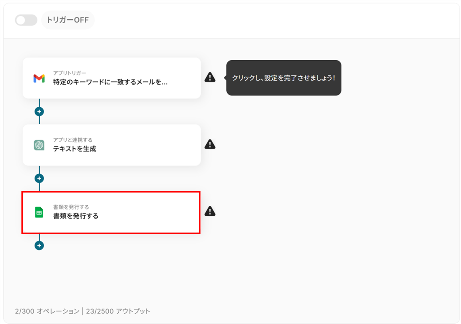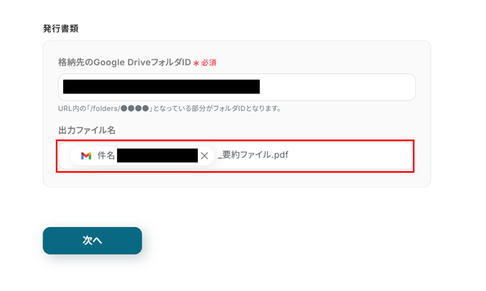 ・書類発行アクションを使用することで、Google Driveに自動でファイルが保存されます。