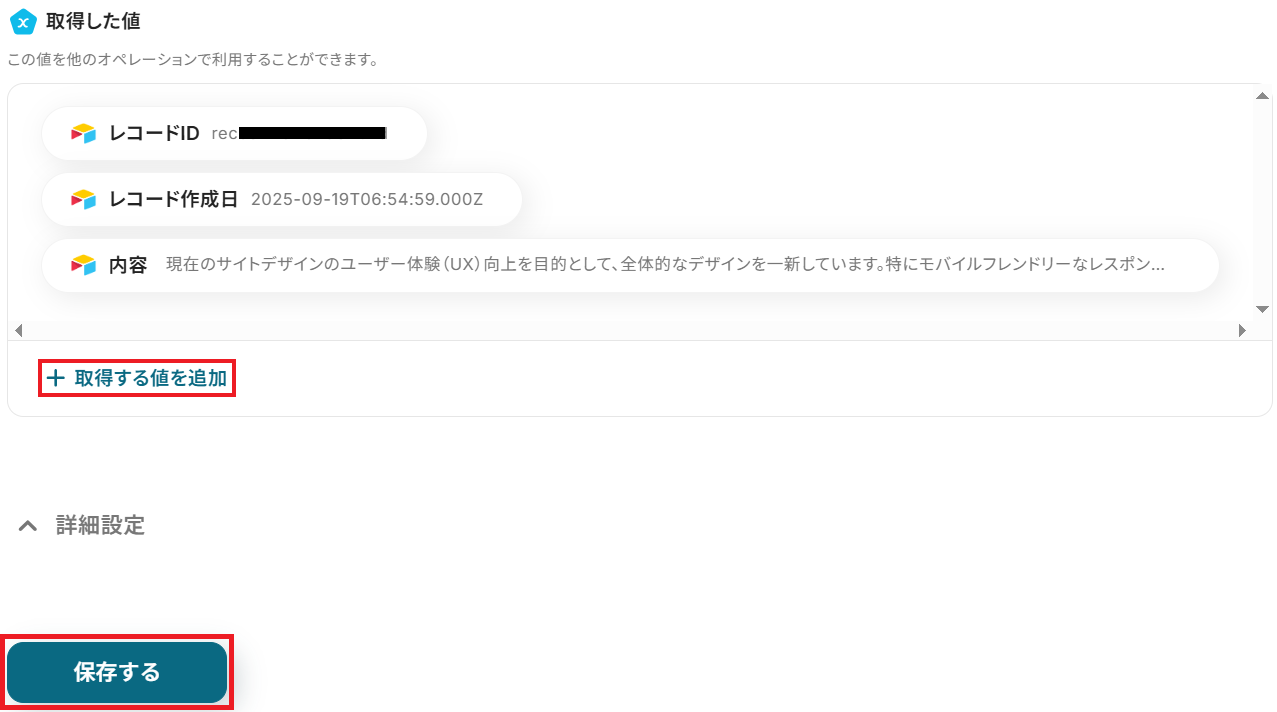成功したら保存しましょう。今回は「+ 取得する値を追加」から「内容」の項目を追加しました!