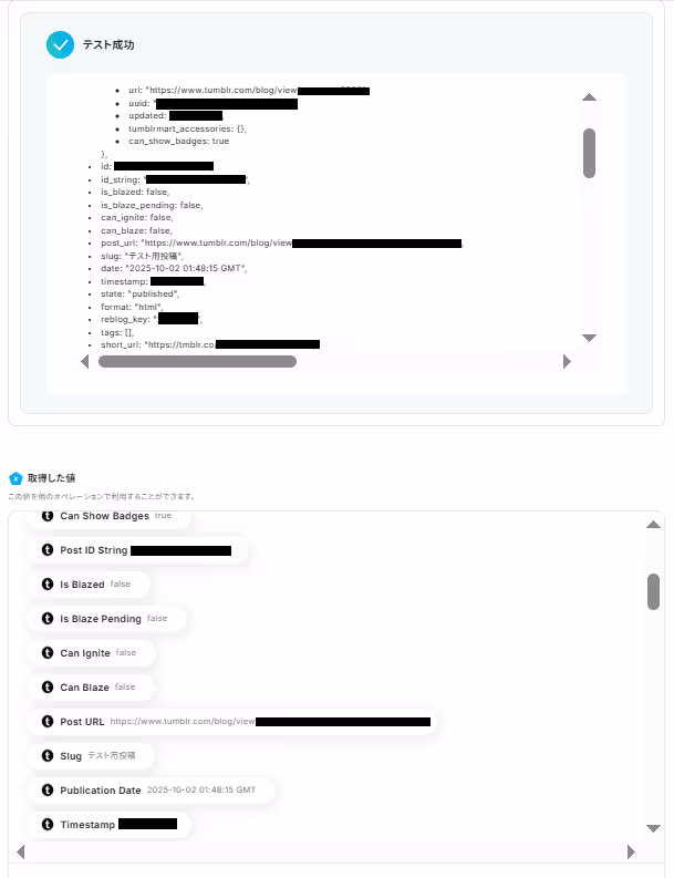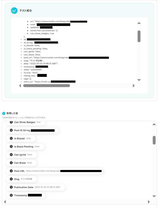 「テスト成功」の文字とリクエスト内容がJSON PATHで表記され、共に「取得した値」として、Tumblrに投稿した内容が反映されていれば成功です!