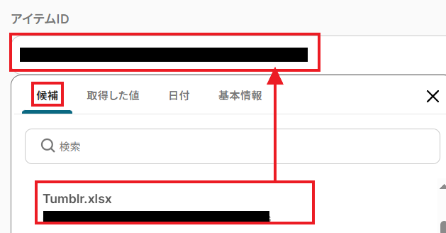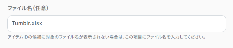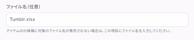 もしアイテムIDに対象のファイルIDが候補として表示されない場合は、「ファイル名(任意)」に直接ファイル名を入力してください。