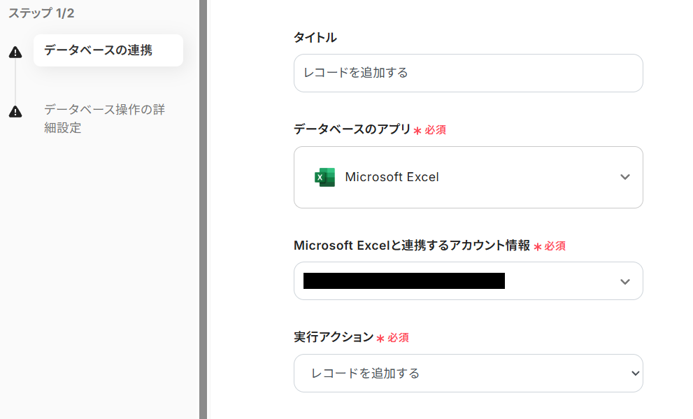 「追加するレコードの値」として、連携しているMicrosoft Excelの項目が表示されます。