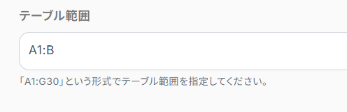 ここでは、例として作成している前述のMicrosoft Excelファイルを対象にするため、テーブルとして機能している範囲として以下のように入力しました。