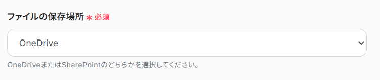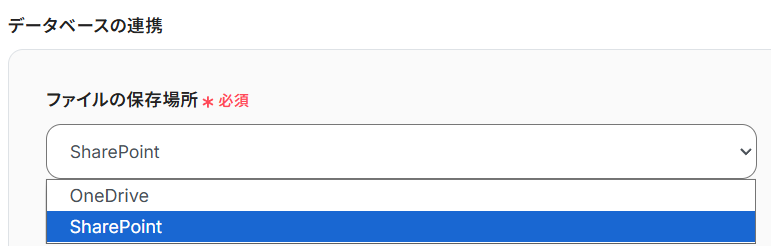 データベース連携の設定を行いましょう。「ファイルの保存場所」は、任意で設定してください。今回は例として「OneDrive」を選択しています。