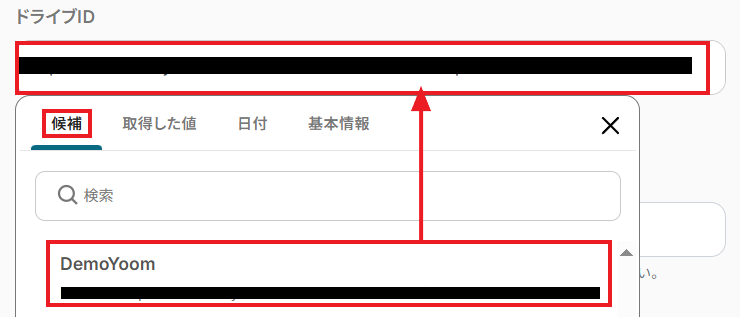 「ドライブID」には、レコードを追加したいMicrosoft Excelファイルが格納されているOneDriveのIDを候補から選択しましょう。