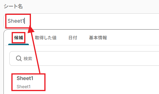 更新対象のMicrosoft Excelファイルを設定できたら、「シート名」を候補から設定します。