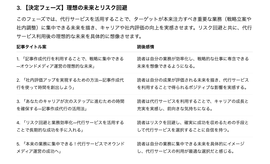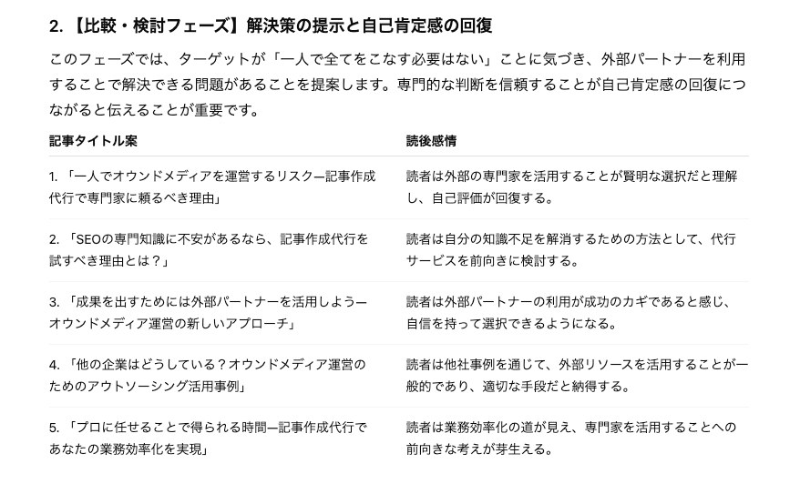 ステップ1で見えた深い悩みに対し、どのような情報をどの順番で届ければ信頼を得られるか、戦略的な記事案を提案させます。