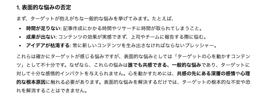 1. 表面的な悩みの否定:まず、一般的に言われる悩み(例:「時間が足りない」「成果が出ない」)を挙げ、なぜそれだけでは「ターゲットの心を動かすコンテンツ」として不十分なのかを分析してください。