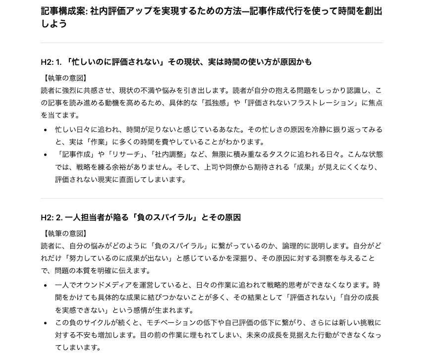 2.【比較・検討フェーズ】解決策の提示と自己肯定感の回復:「一人で全てやる必要はない」という気づきを与え、外部パートナー(記事作成代行)を活用することが「専門的な判断」であることを伝える記事。