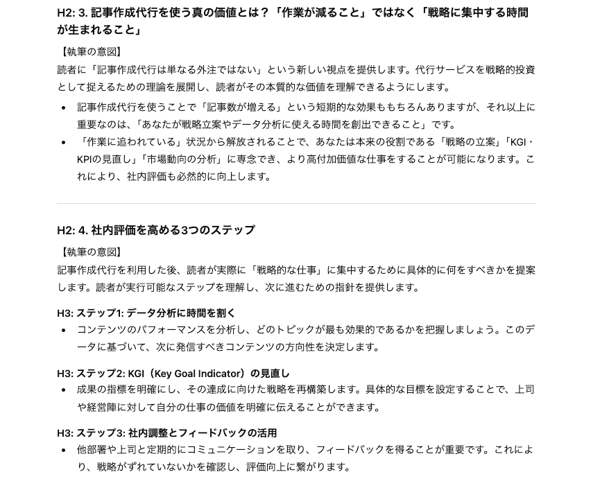 見出し(H2、H3)ごとに、その章で伝えるべき要点も箇条書きで添えてください。