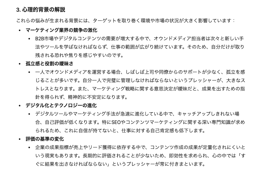 「時間が足りない」といった表面的な悩みを超え、ターゲットの孤独や社内評価への恐怖といった本音が論理的に推論されています。