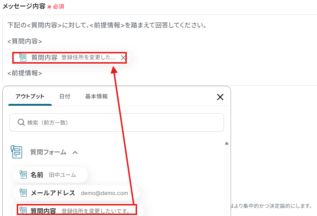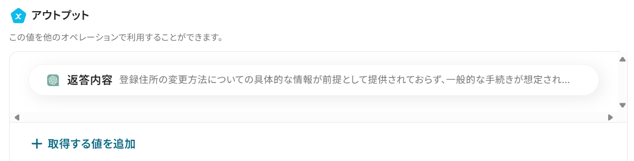 ここに固定の問い合わせ内容などを設定してしまうと、フロー起動時に毎回それについて生成されてしまうので、アウトプットから必ず選択してください。