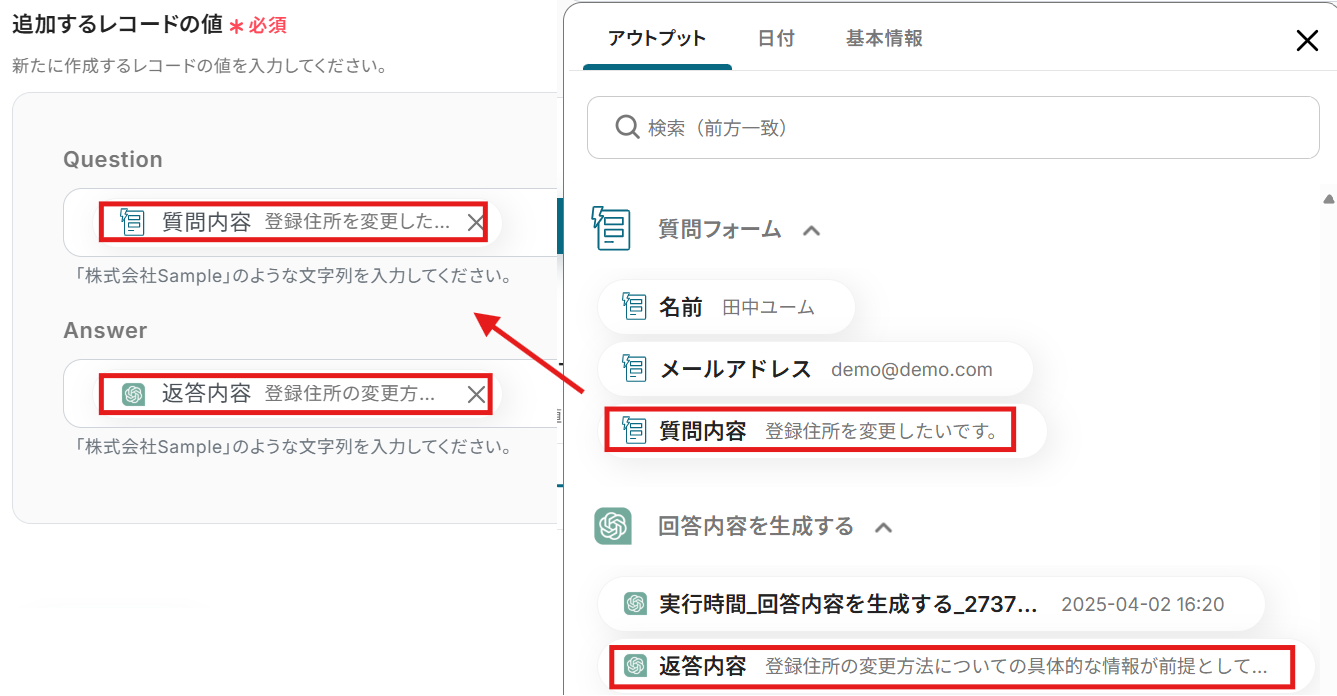 次に進み、アウトプットから追加するレコードの値を設定していきます。