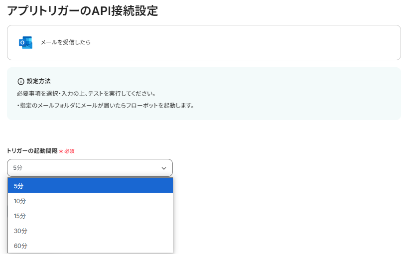・トリガーは5分、10分、15分、30分、60分の間隔で起動間隔を選択できます。