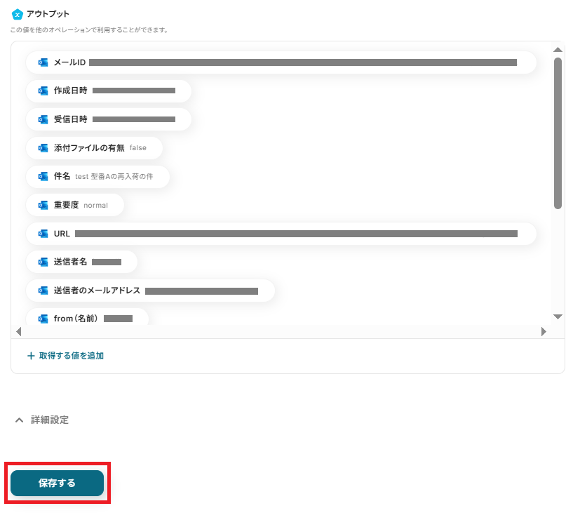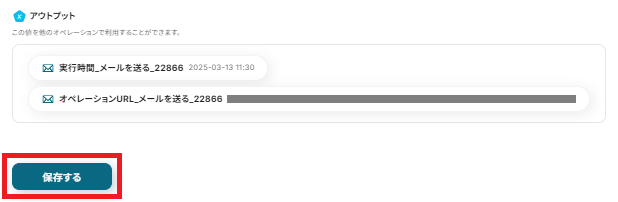 成功したら保存してください。ここで取得したアウトプットの値は次のステップで活用できます。