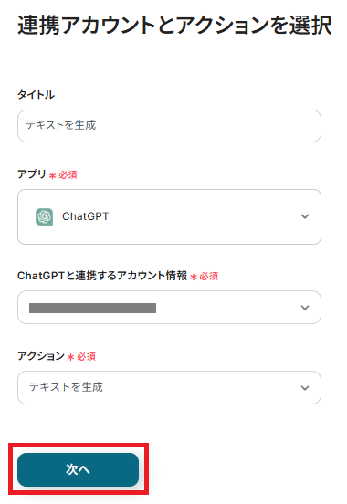 アクションは「テキストを生成」です。「次へ」をクリック。