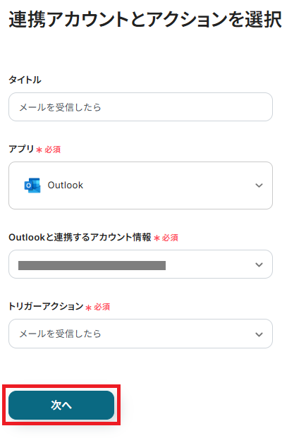 タイトルは編集可能です。トリガーアクションは「メールを受信したら」にし、アカウント名が正しいか確認して「次へ」をクリックしてください。