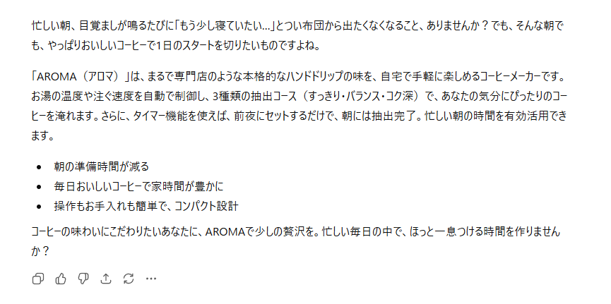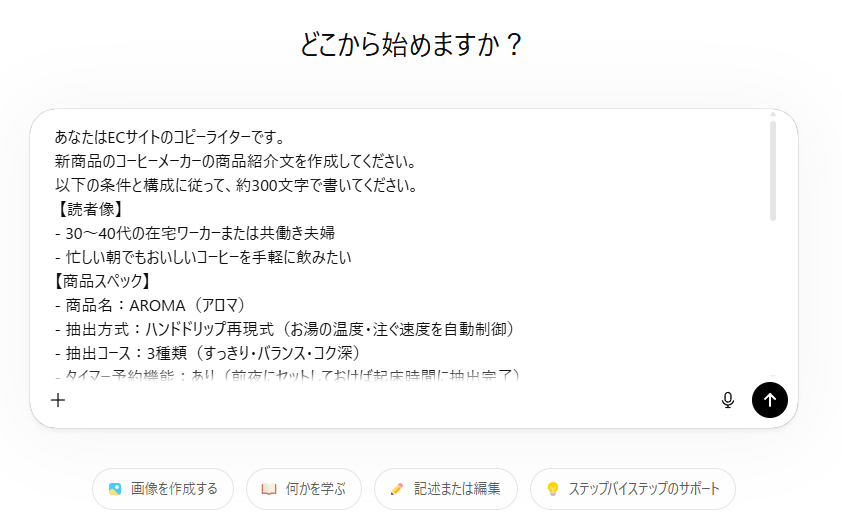 回答精度の向上:AIが理解しやすい形式で指示するため、求めている回答が得られやすくなります 。 業務時間の短縮:ゼロから指示文を考える必要がなくなり、入力の手間が省けます 。 属人化の解消:誰が指示を出しても同じクオリティの成果物が得られるようになります。