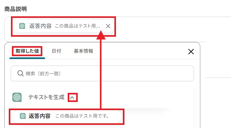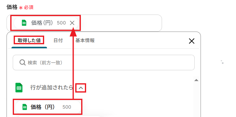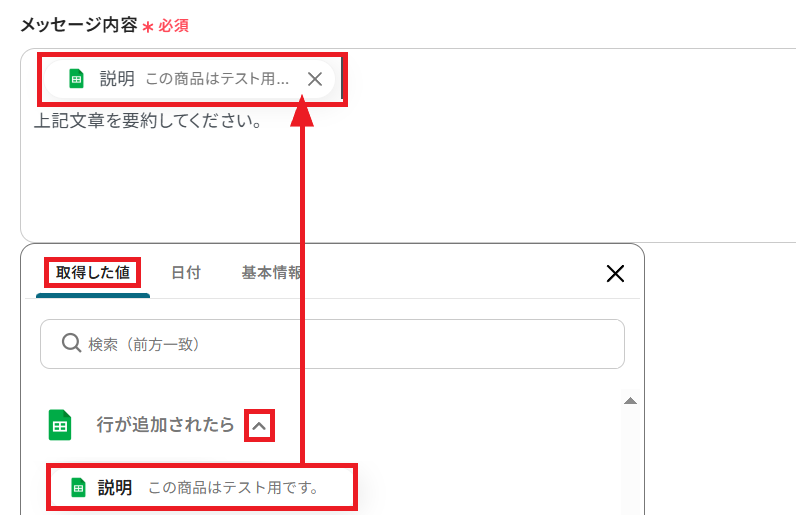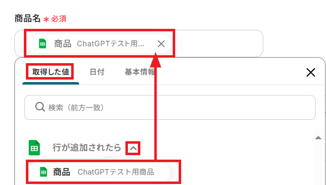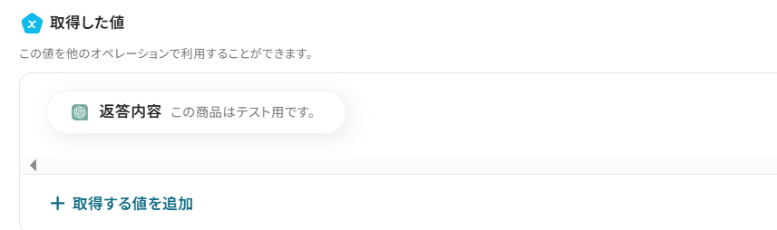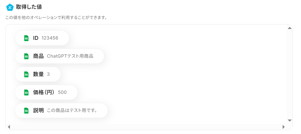 以下のように、「取得した値」としてGoogle スプレッドシートに追加した行の内容が反映されていれば成功です!