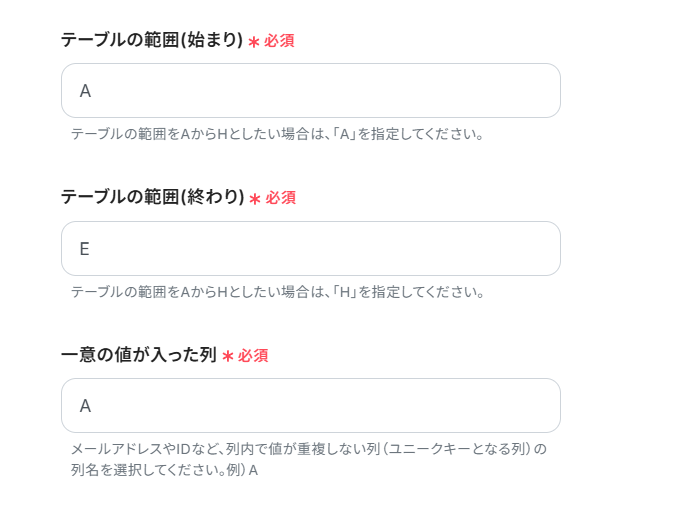 ※Googleスプレッドシートのテーブル範囲の定義についてはこちらをご参照ください。 https://intercom.help/yoom/ja/articles/8703465
