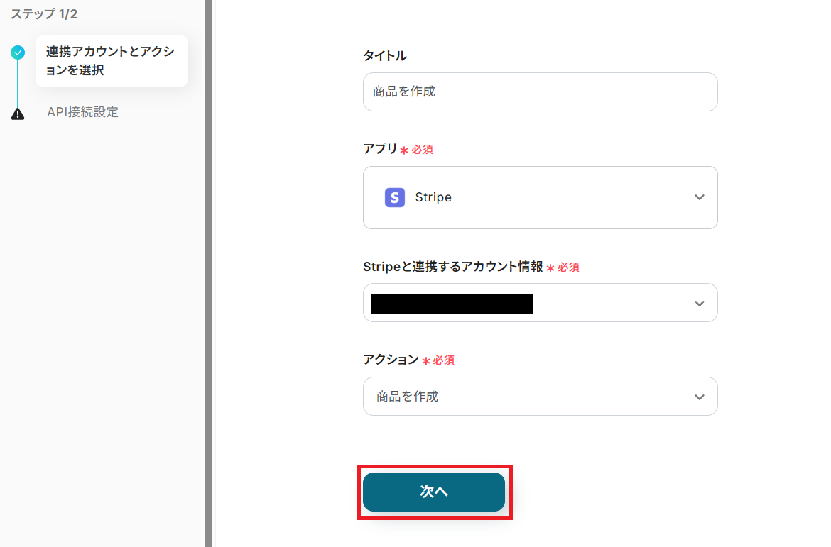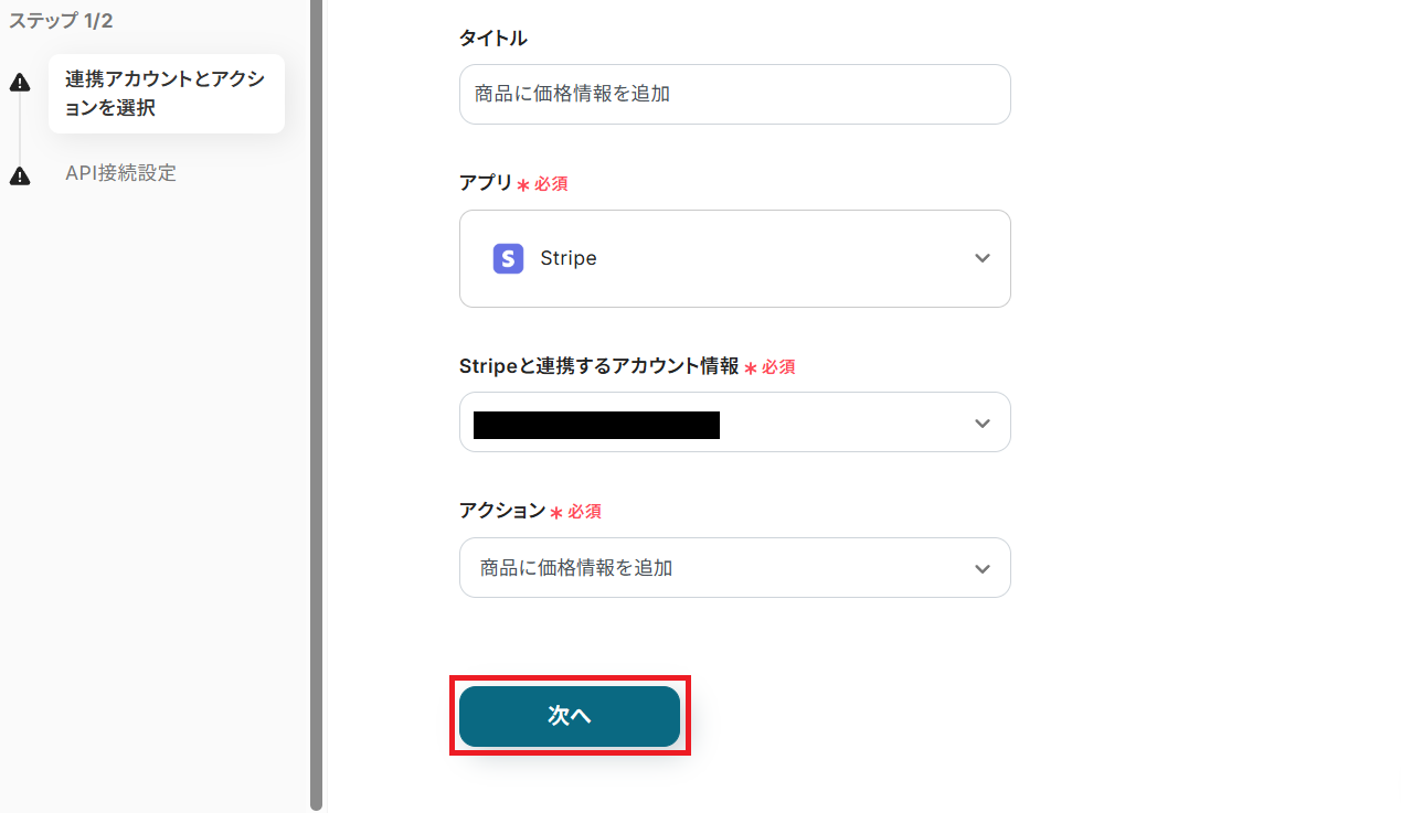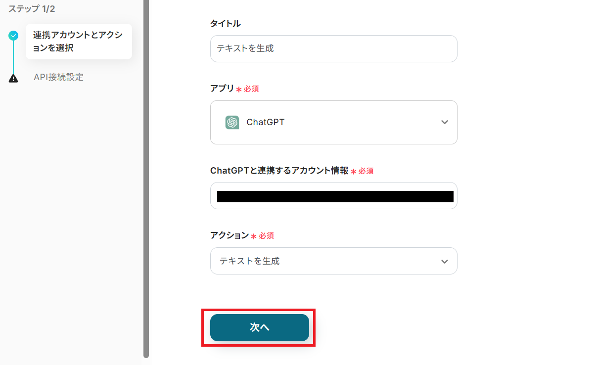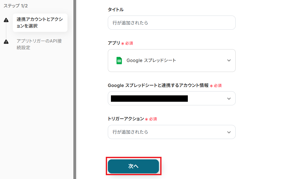 タイトルを任意で設定し、Google スプレッドシートと連携するアカウントやアクション内容を確認したら「次へ」を押してください。