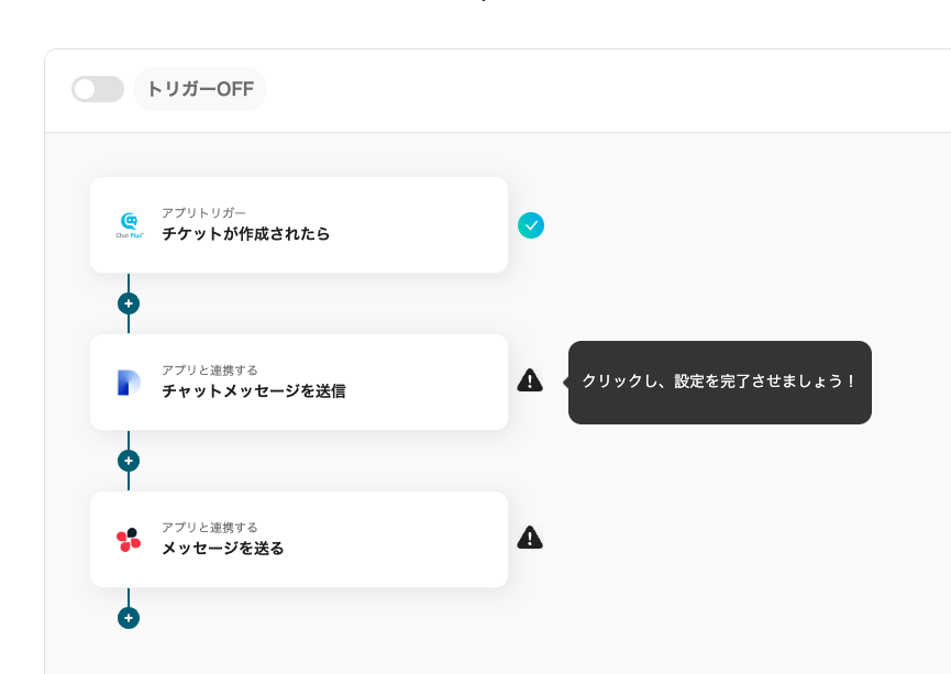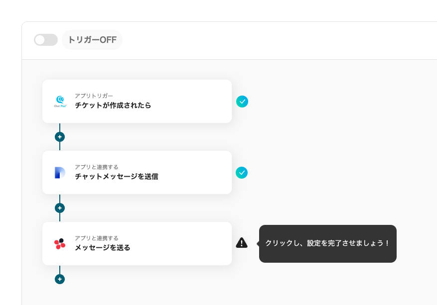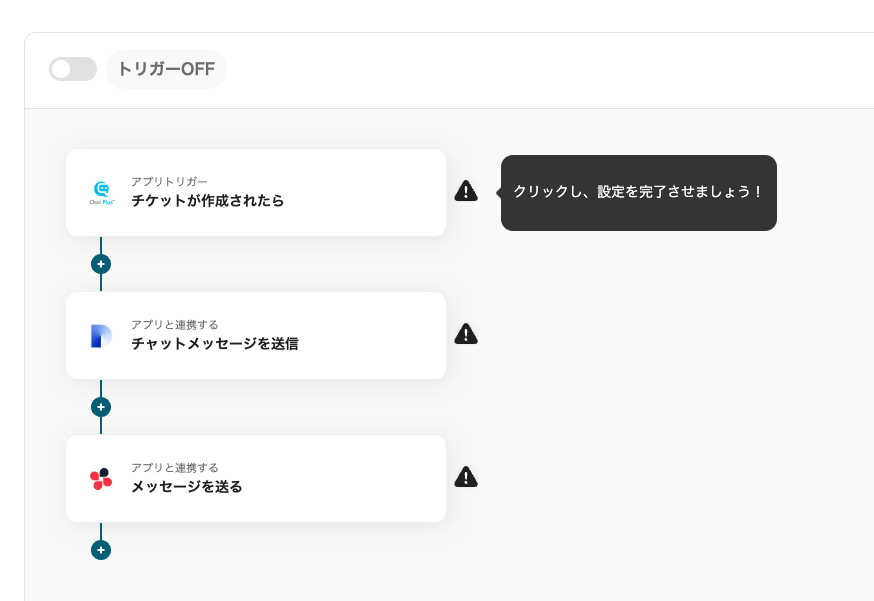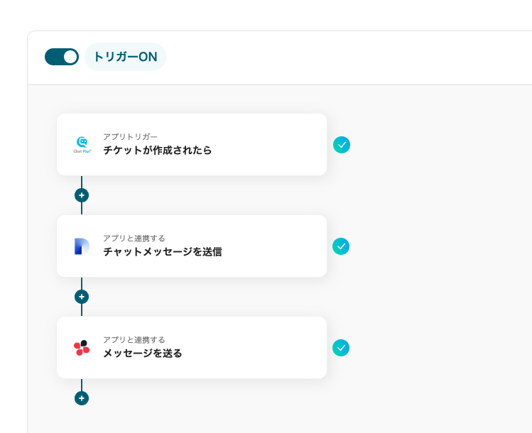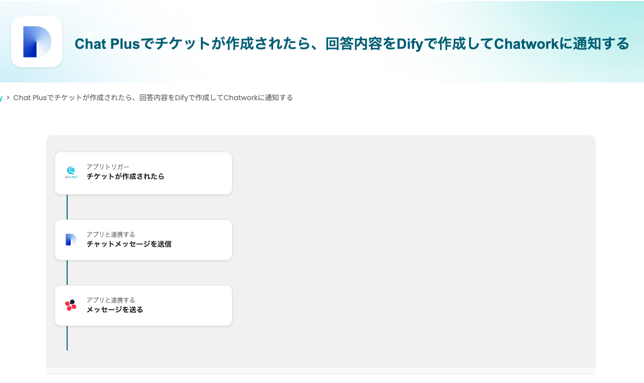 ここからは、【Chat Plusでチケットが作成されたら、Difyで問い合わせの回答生成してChatworkに送信する】プログラミングなしで構築するフローの手順を解説します。