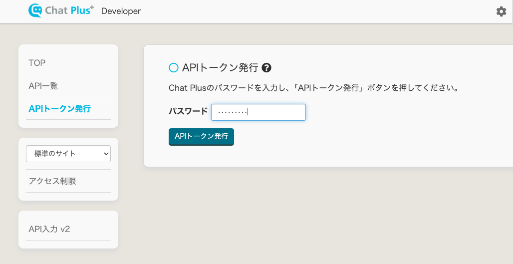 次の画面のAPIトークン発行を選択すると、Chat Plusに登録済みのパスワードが求められます。