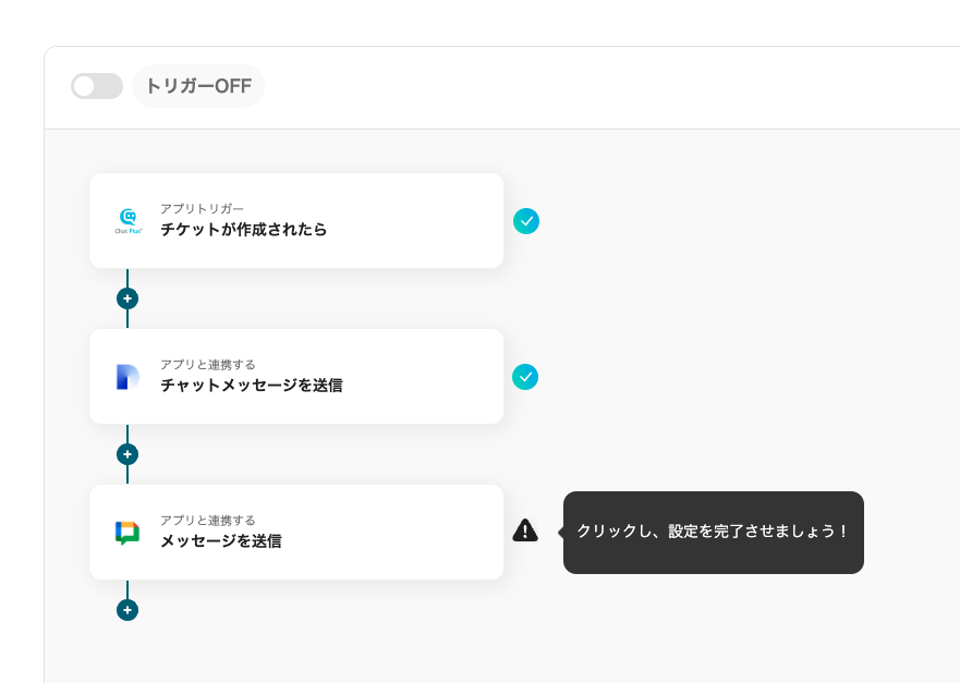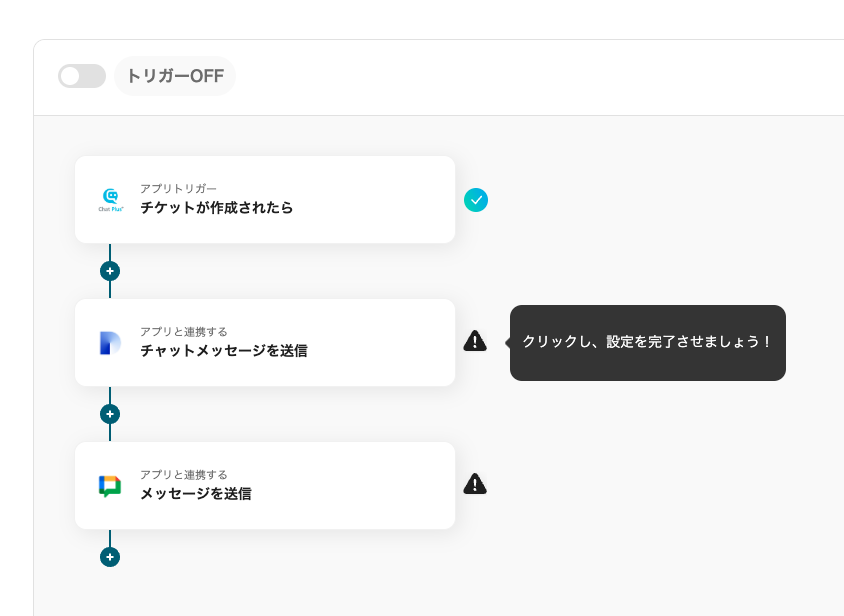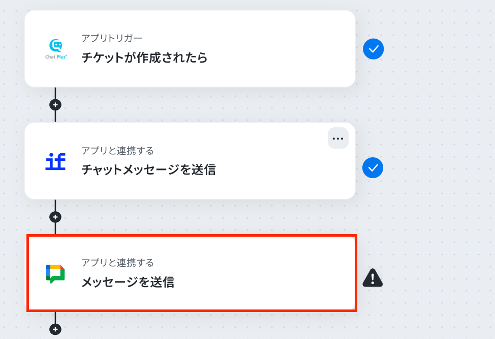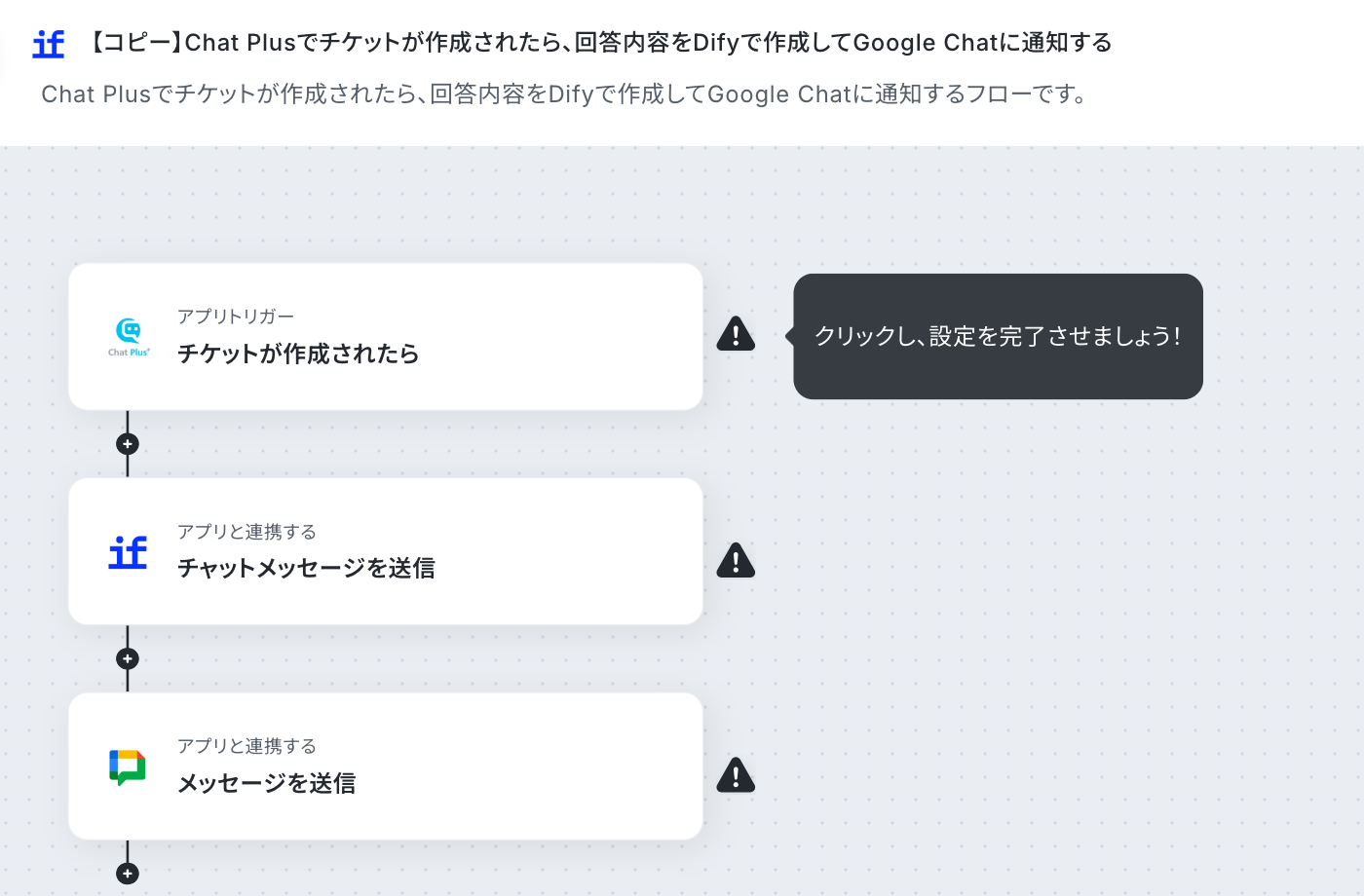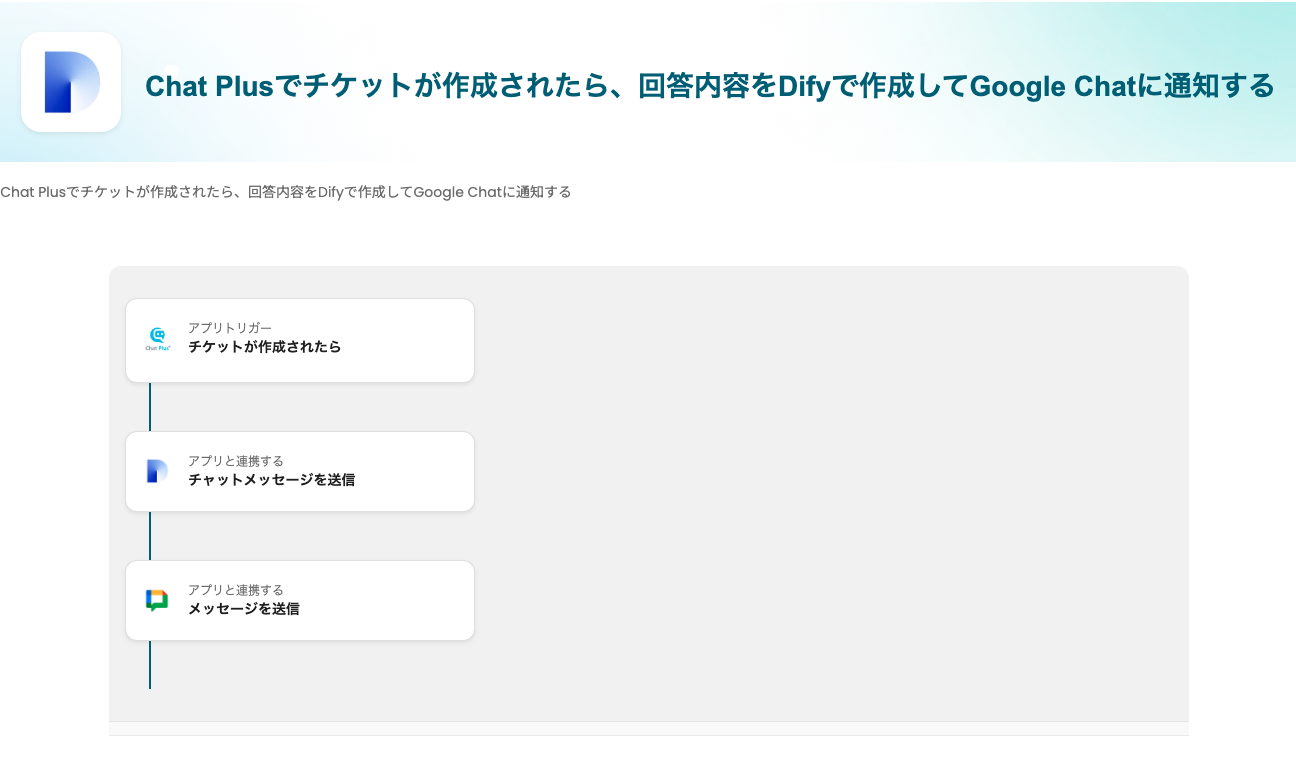 ここからは、【Chat Plusでチケットが作成されたら、回答内容をDifyで作成してGoogle Chatに通知する】プログラミングなしで構築するフローの手順を解説します。