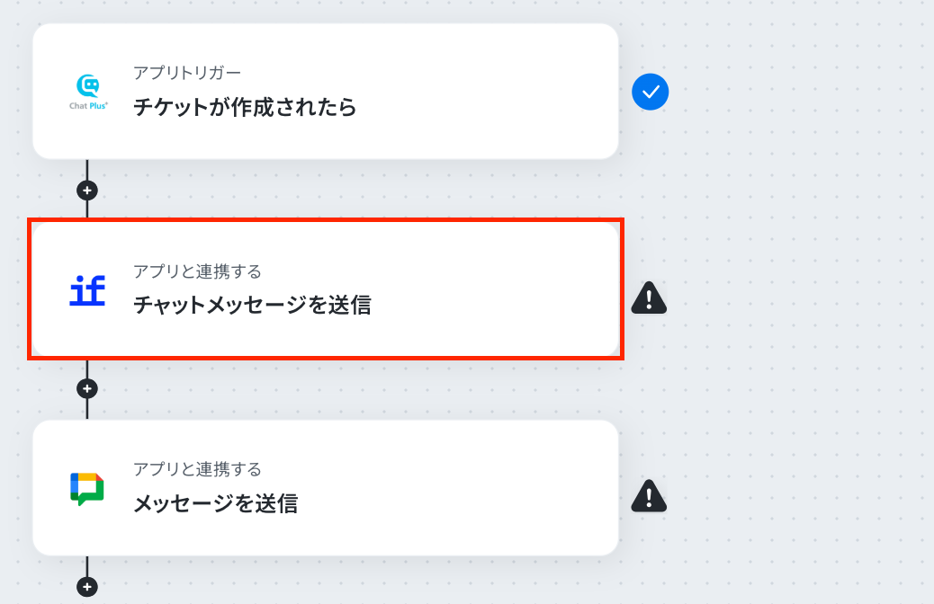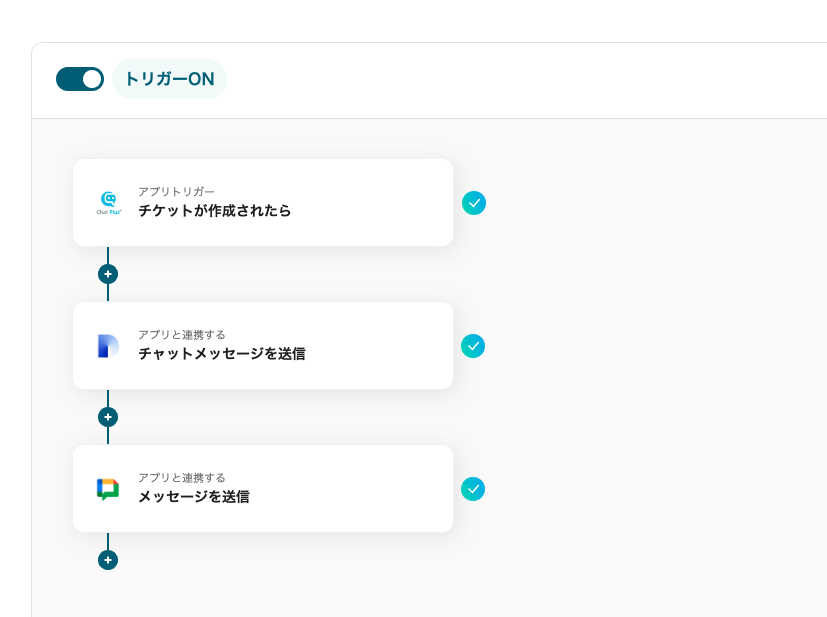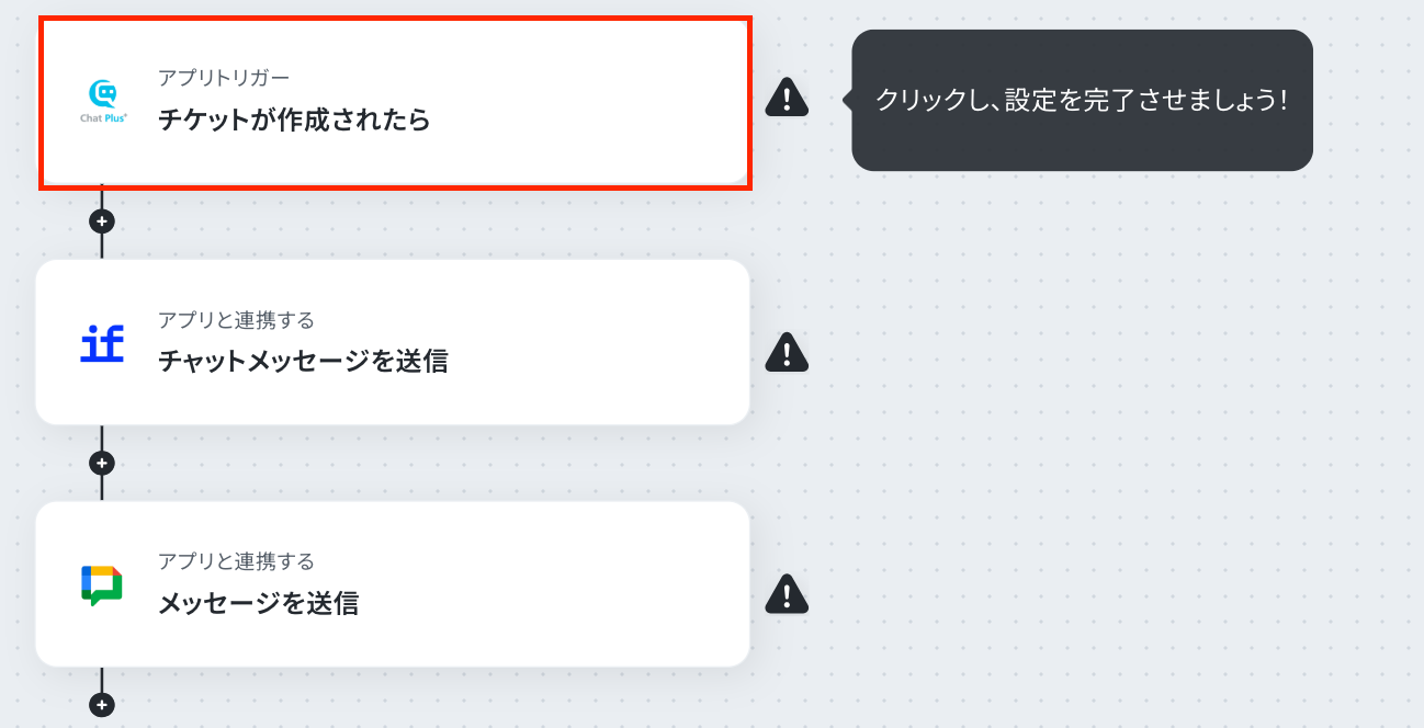 - トリガーでChat Plusの「チケットが作成されたら」というアクションを設定します。