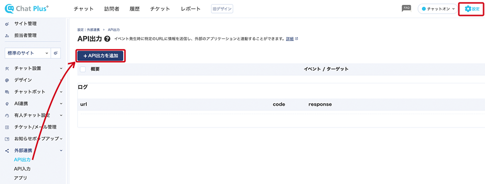 - Chat Plusの右上にある設定アイコンをクリックすると左にメニューバーが表示されます。この中の「外部接続」タブ内から「API出力」を選択します。右画面内の「+API接続を追加」をクリックします。