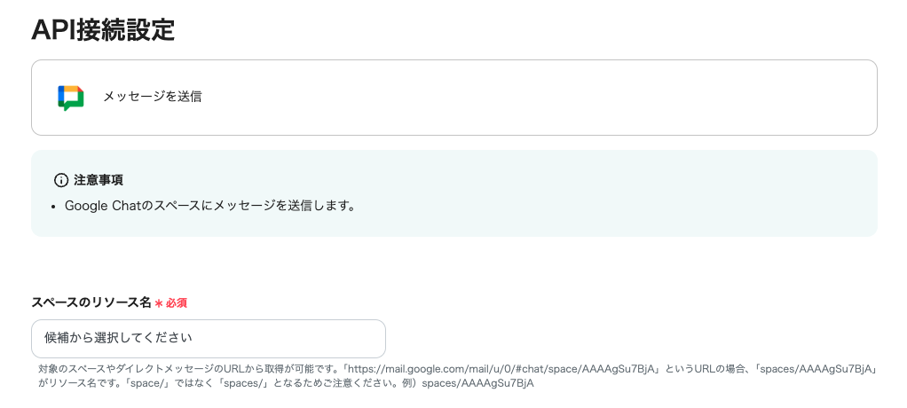 - Google Chatへの通知設定では、メッセージを送信するスペースを任意で指定することが可能です