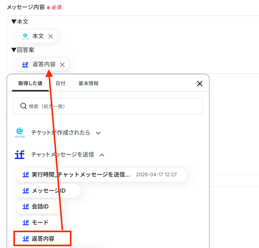 - 通知するメッセージ本文は、Chat Plusで取得したチケット情報やDifyが生成した回答内容などを変数として自由に組み込めます。