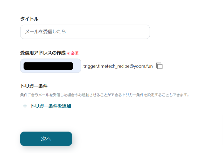 受信用のメールアドレスを設定して、必要であればタイトルをわかりやすいものに修正してから次に進んでください。