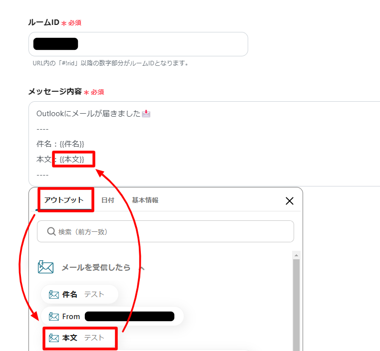 ルームIDを候補から選択して、メッセージ内容はアウトプットを活用しながら入力してみましょう。