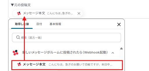 以下のようにChatworkから取得した値をメッセージの中に設定し、ChatGPTでリライトさせるように設定しましょう。