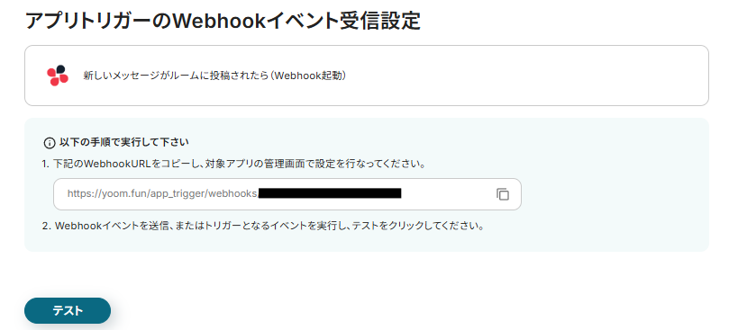 入力完了後「テスト」をクリックし、実際にChatworkにメッセージが送信されているか確認しましょう。