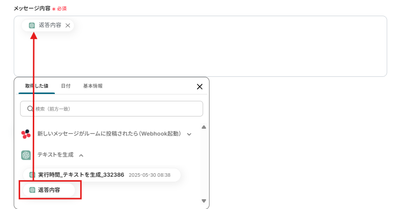メッセージ内容には取得した値からChatGPTからの返答内容を入力します。
