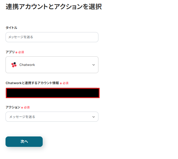 連携アカウントとアクションを選択する画面が表示されるので、今回連携するChatworkのアカウントを確認し「次へ」をクリックします。