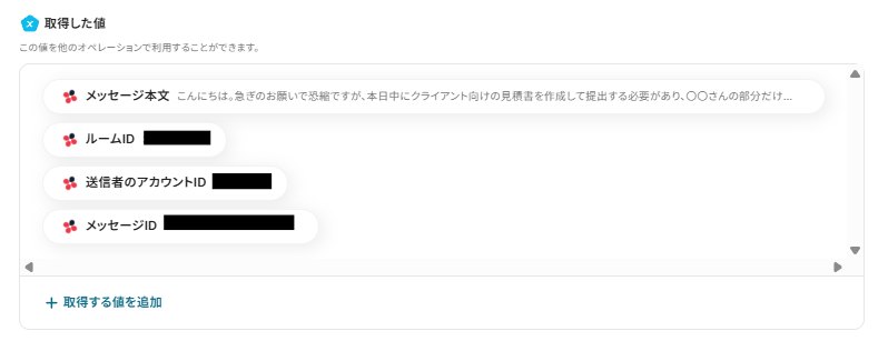 設定後、実際にメッセージを送信し、メッセージの内容が取得した値に表示されているか確認しましょう。