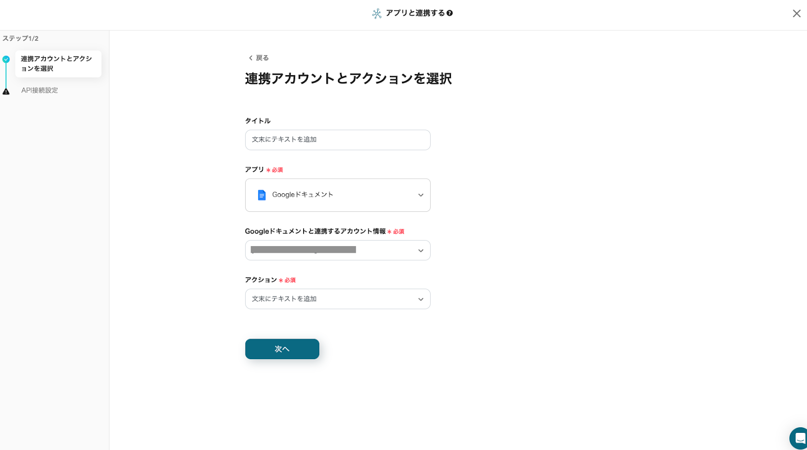 タイトルの任意編集とアカウント情報の確認を行い、「次へ」をクリックしてください。