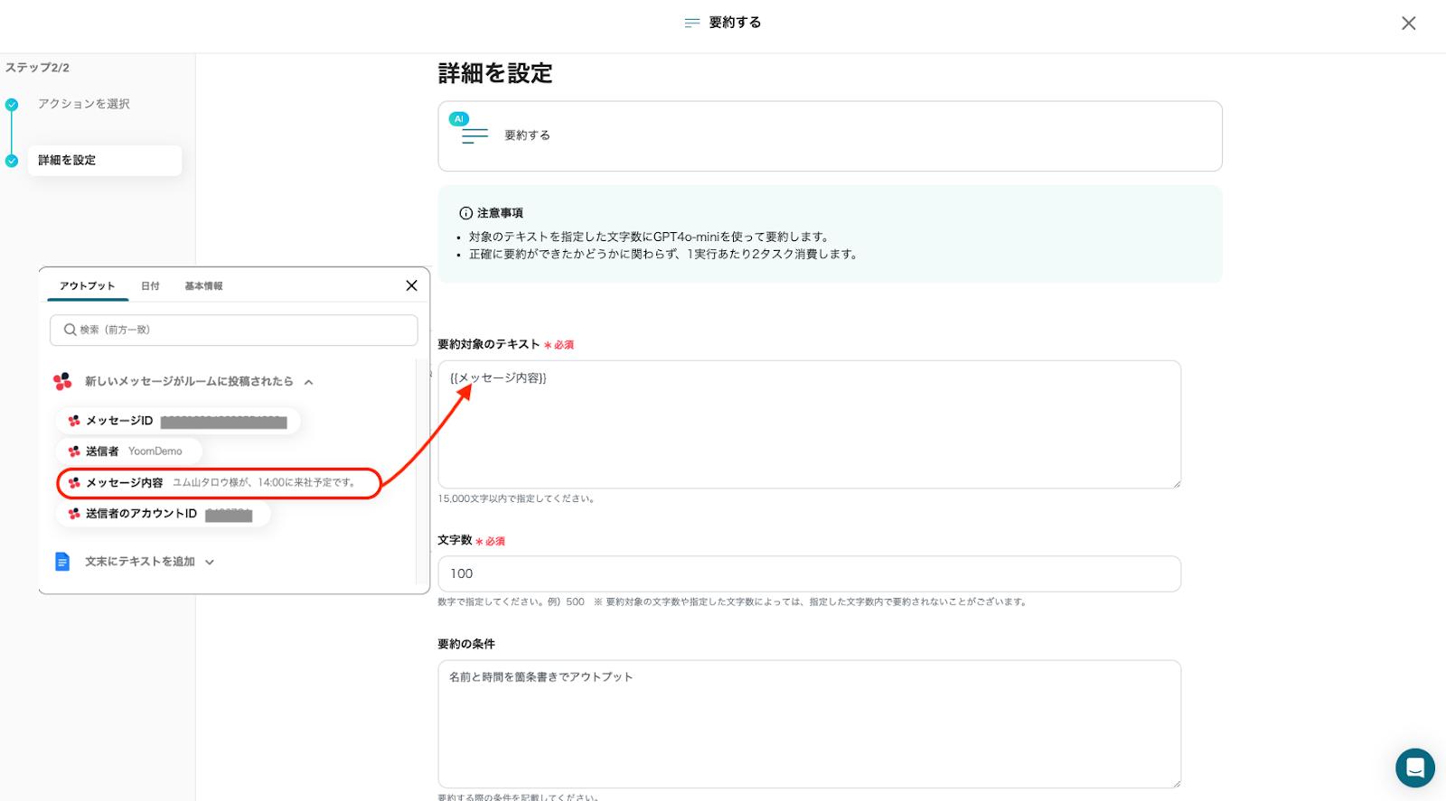 次に、送信されたメッセージをAIで要約する設定を行います。
