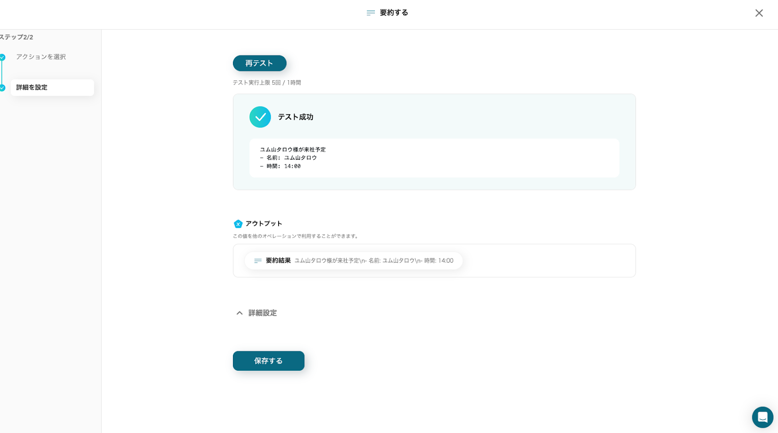 アウトプットに表示された要約結果を確認し、「保存する」をクリックしてください。