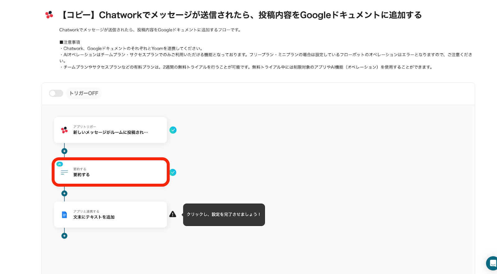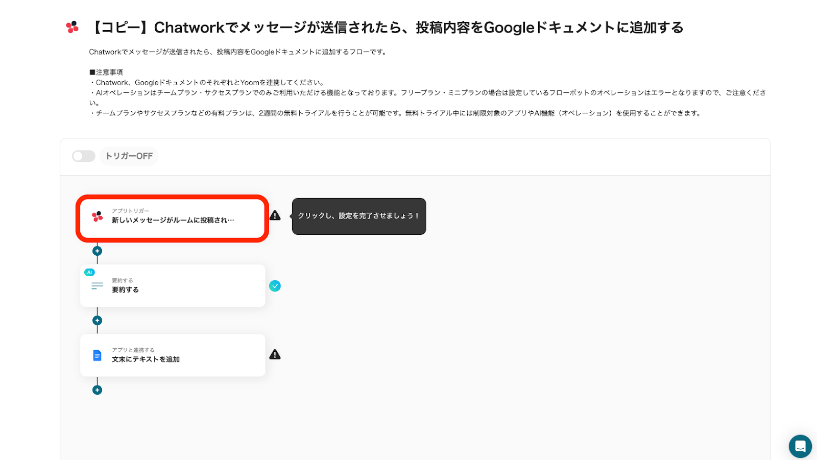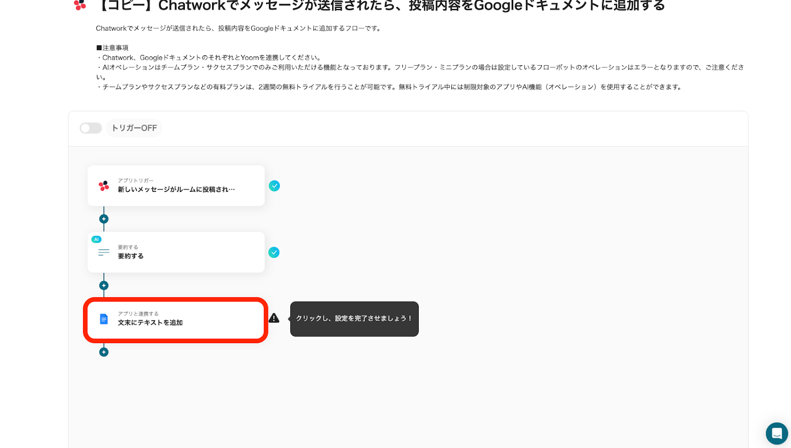 最後に「トリガーをON」をクリックし、フロー稼働の準備が完了です。これで、Chatworkでメッセージが送信されたら、投稿内容がGoogleドキュメントに自動追加されます。