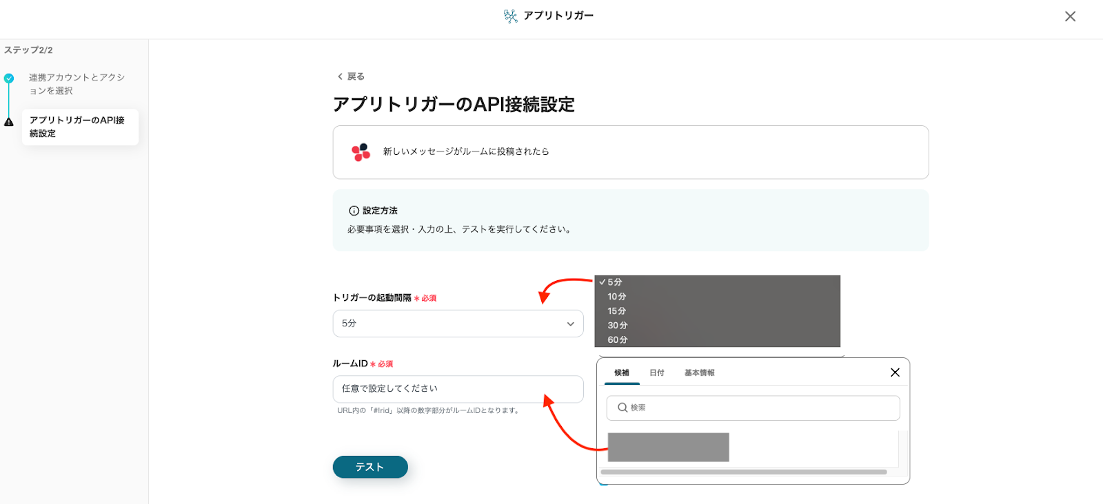 「ルームID」は、注釈を参照しURLから引用するか、入力欄をクリックし表示された候補からルームIDを選択してください。