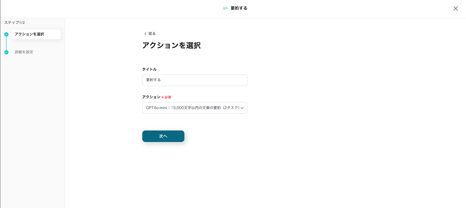 タイトルは編集可能ですが、トリガーアクションは変更せず「次へ」をクリックしてください。