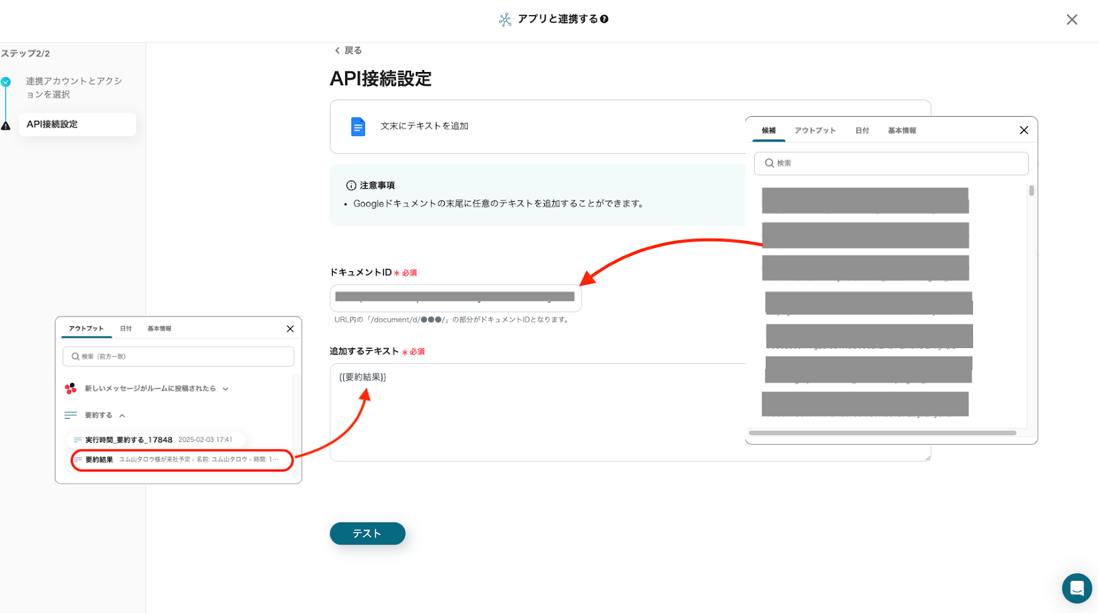 「追加するテキスト」は、入力欄をクリックし表示された候補から「要約結果」をクリックしてください。