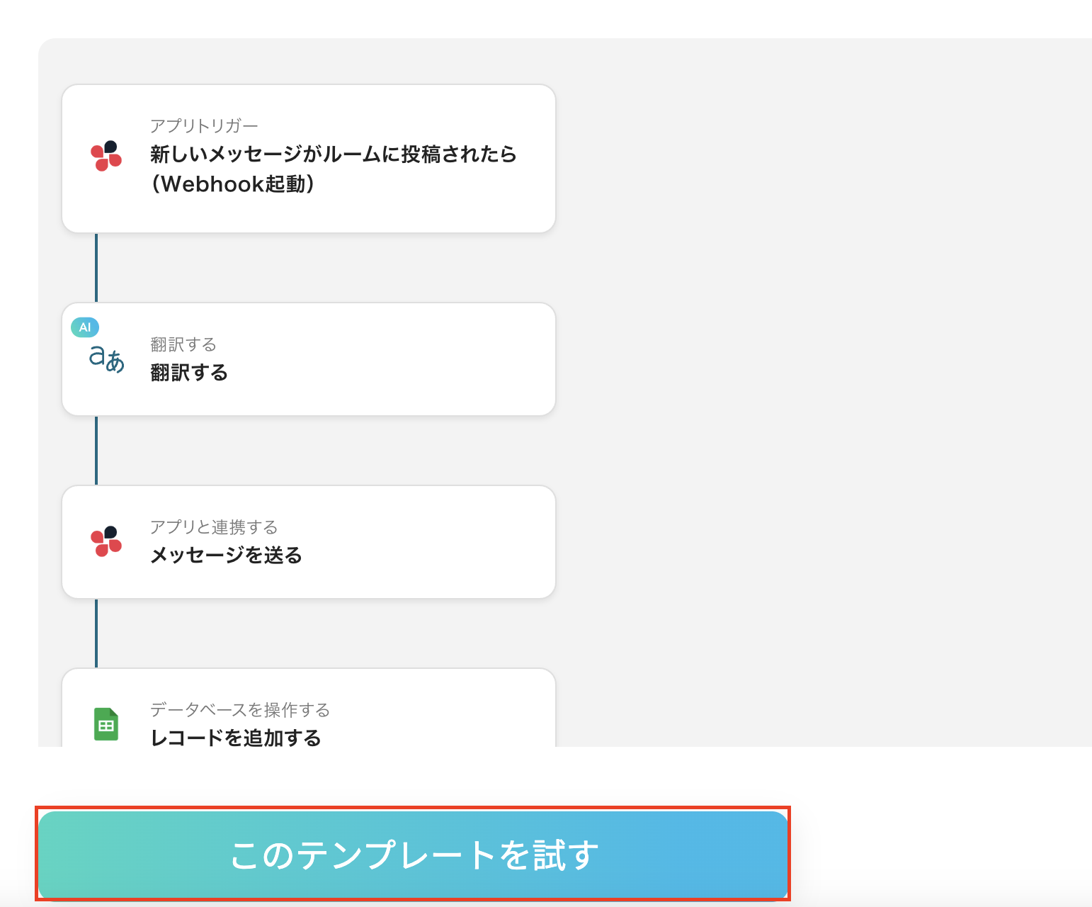 「Google スプレッドシートで追加された文章を英語に翻訳しChatworkに通知する」フローは、情報共有の効率化と手間の削減を実現する業務ワークフローです。