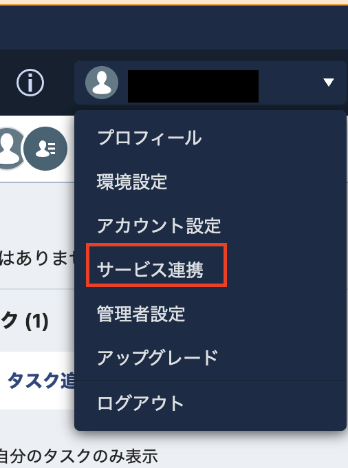 WebhookURLの設定は、右上のアカウント情報をクリックし、サービス連携を選択します。