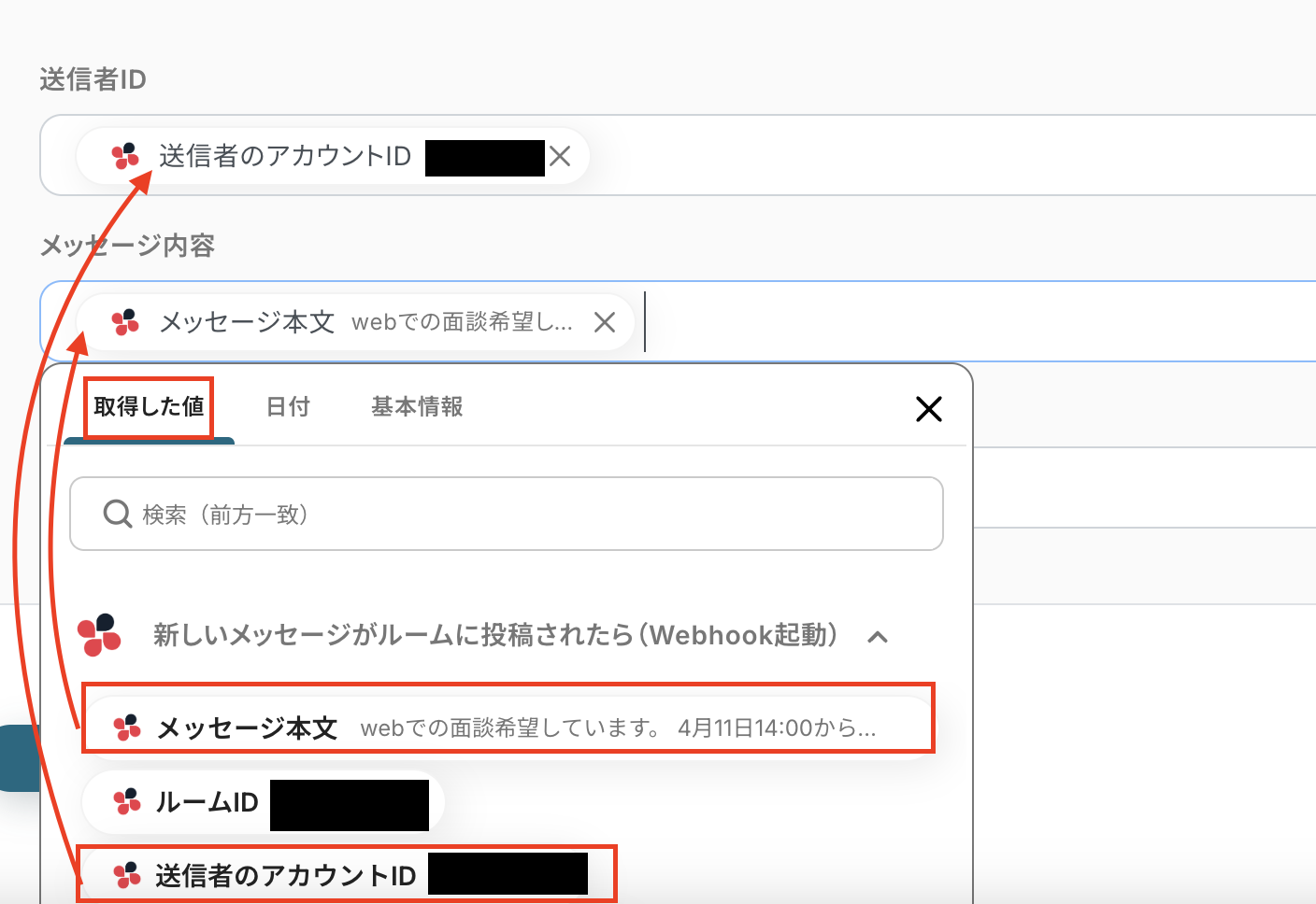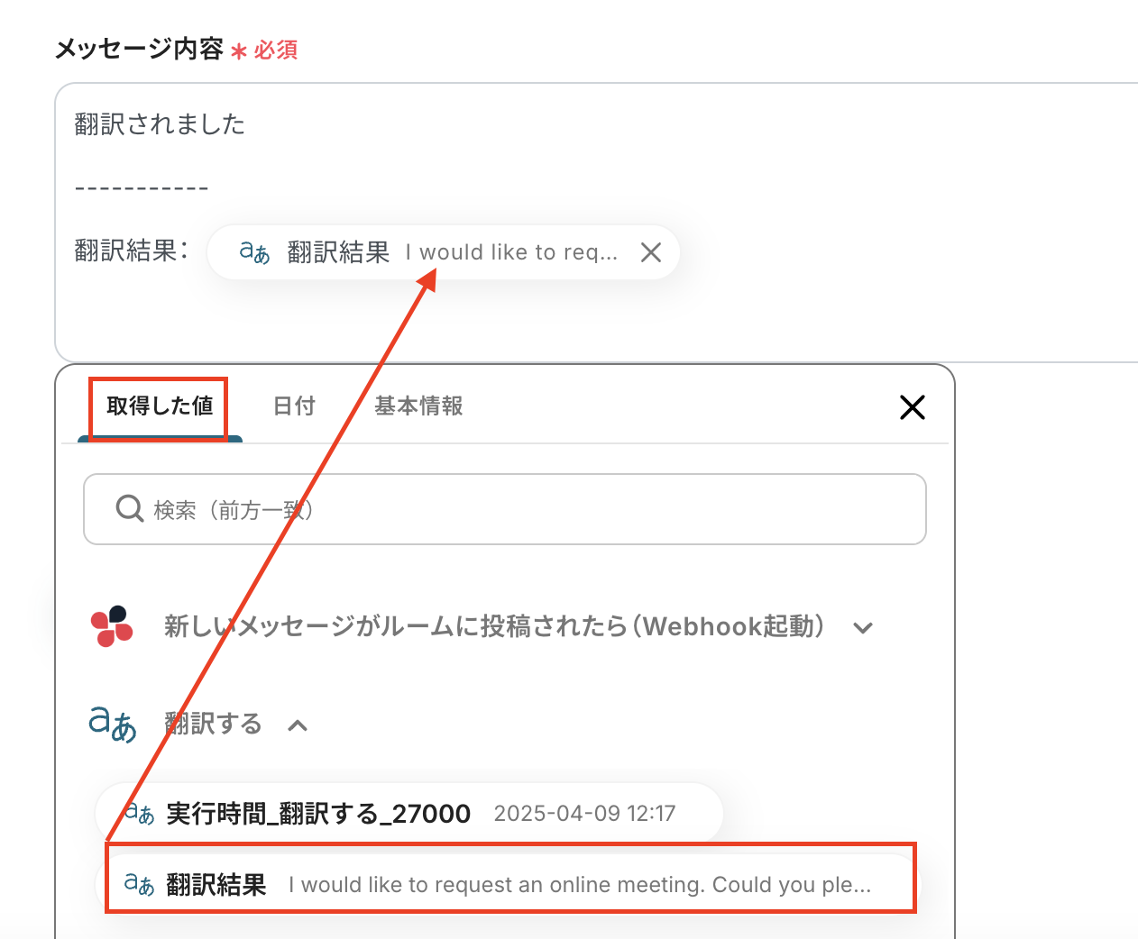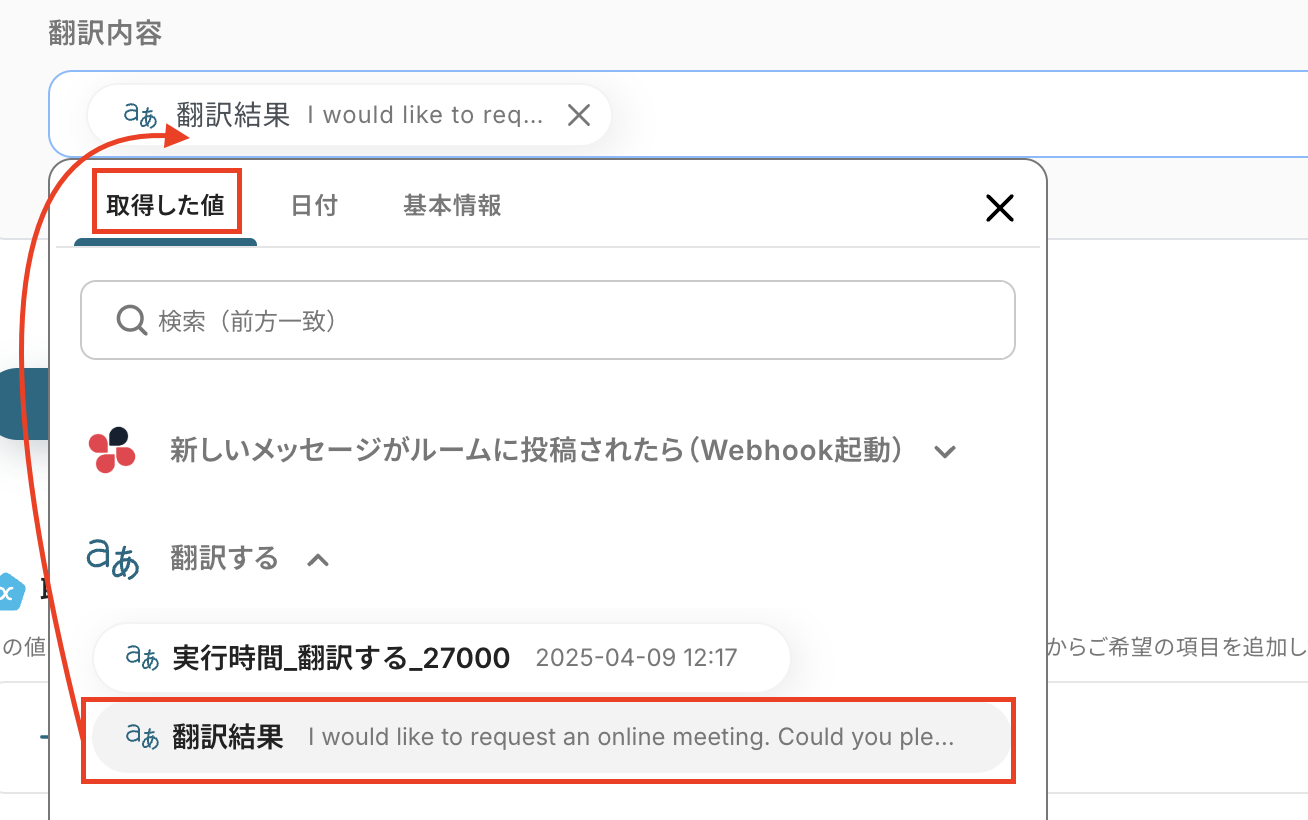 ここでは送信者のID、メッセージ本文、翻訳結果を追加したいので、「取得した値」から選択しましょう。