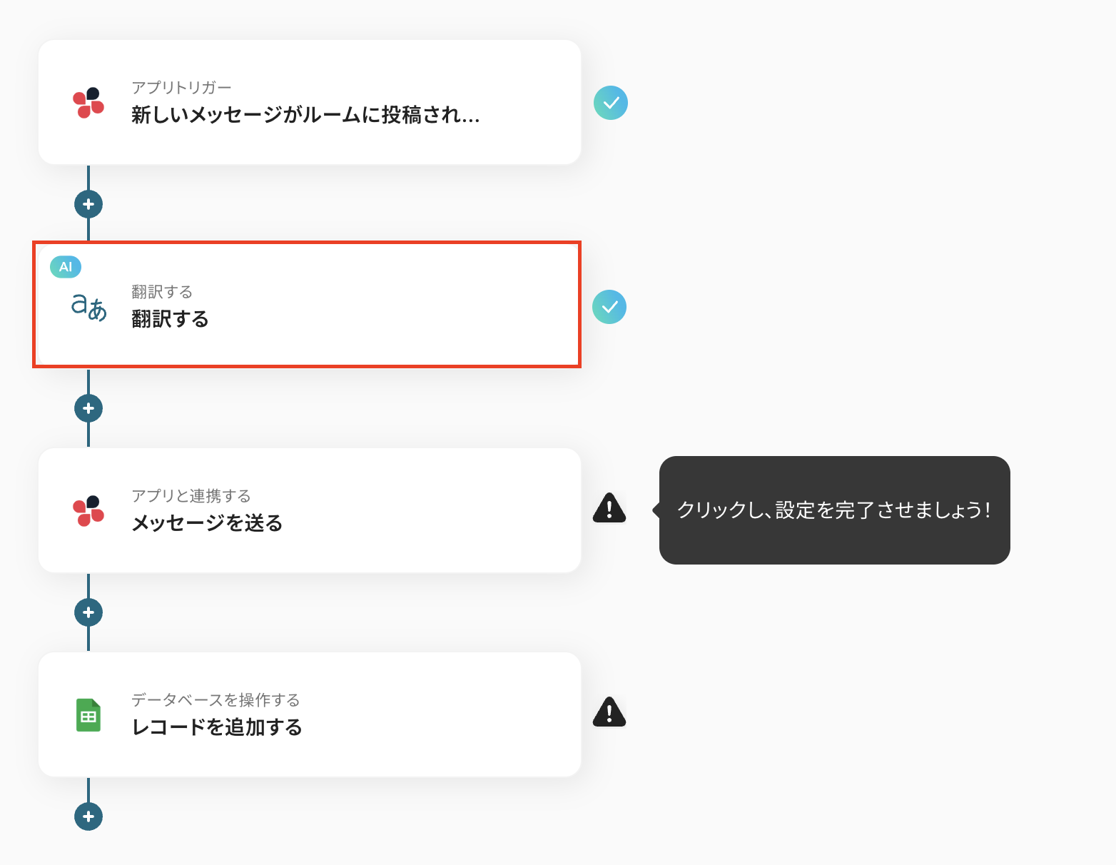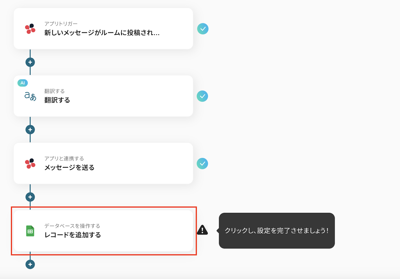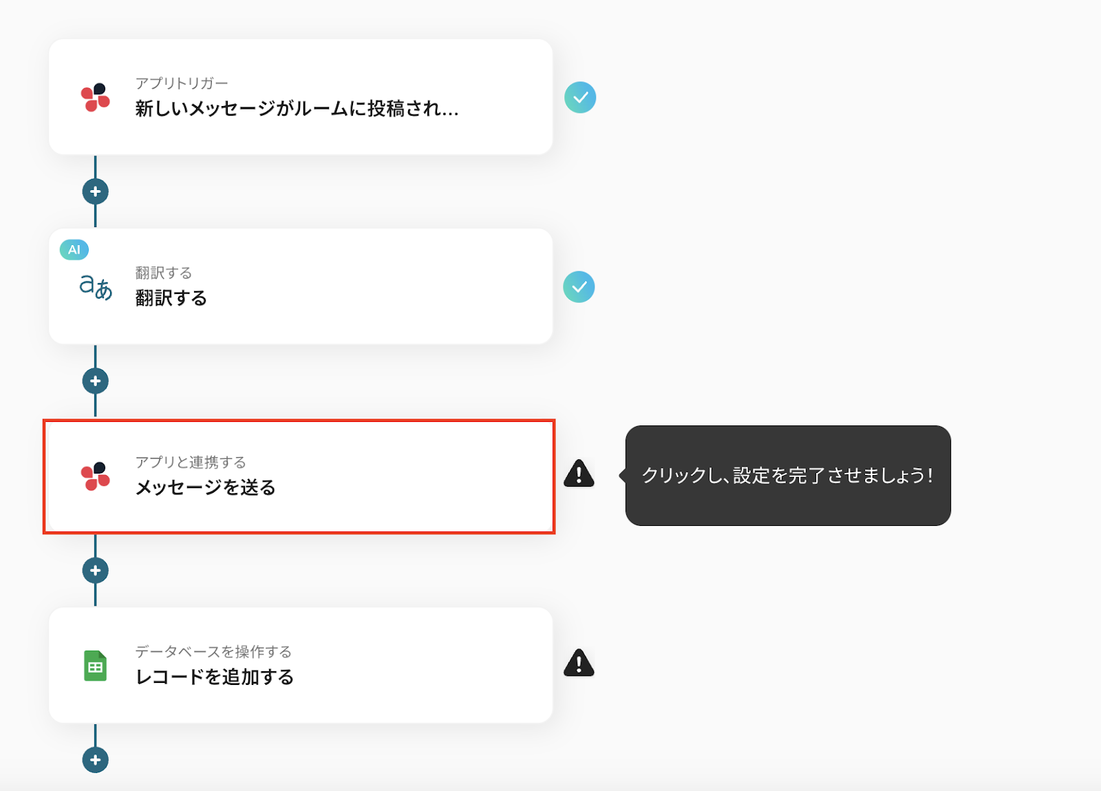コピーしたテンプレートの「新しいメッセージがルームに投稿されたら」をクリックしてください。