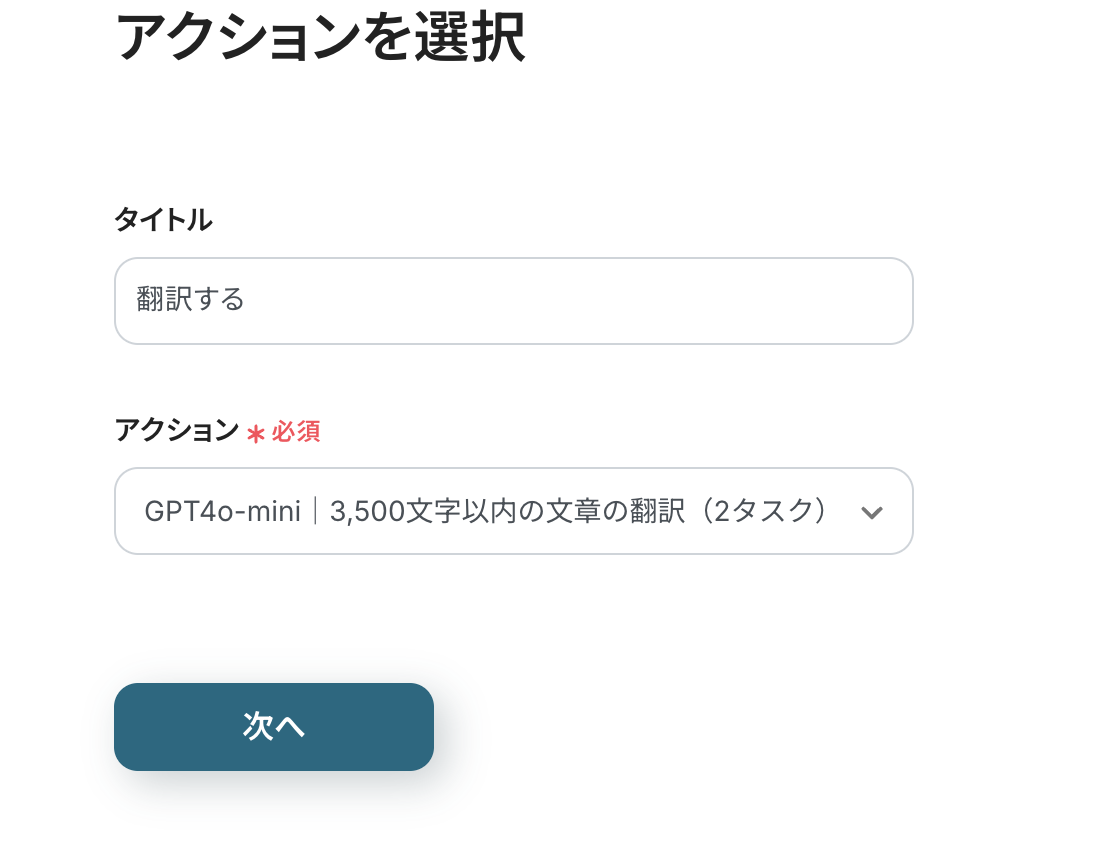 アクションは、翻訳する文字数に応じて設定し、次へをクリックしてください。